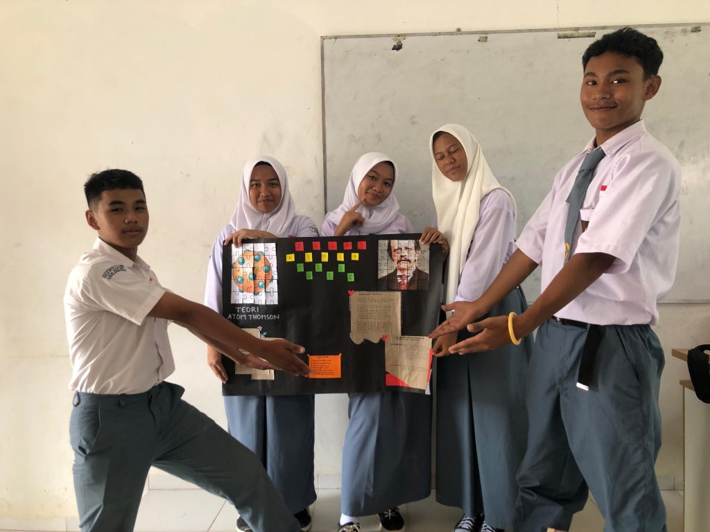 Menyusun puzzle tentang jenis atom dan penemunya, kemudian menuliskan pengertian, kelebihan, serta kekurangannya, lalu dijelaskan bersama kelompok yang sudah ditentukan.